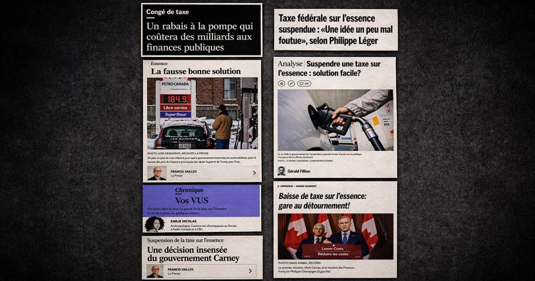 Le 14 avril, le gouvernement fédéral de Mark Carney a annoncé la suspension de la taxe d’accise fédérale sur l’essence. Résultat : environ 10 cents de moins le litre pour l’essence, 4 cents pour le diesel.