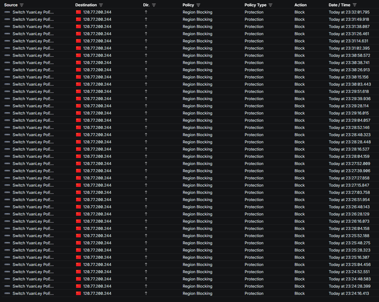 Fait intéressant: la Switch a fait 7231 requêtes vers la Chine en 24h (du 19 avril 2026 au 20 avril 2026), soit plus de 5 requêtes par minute ou une toute les 12 secondes.